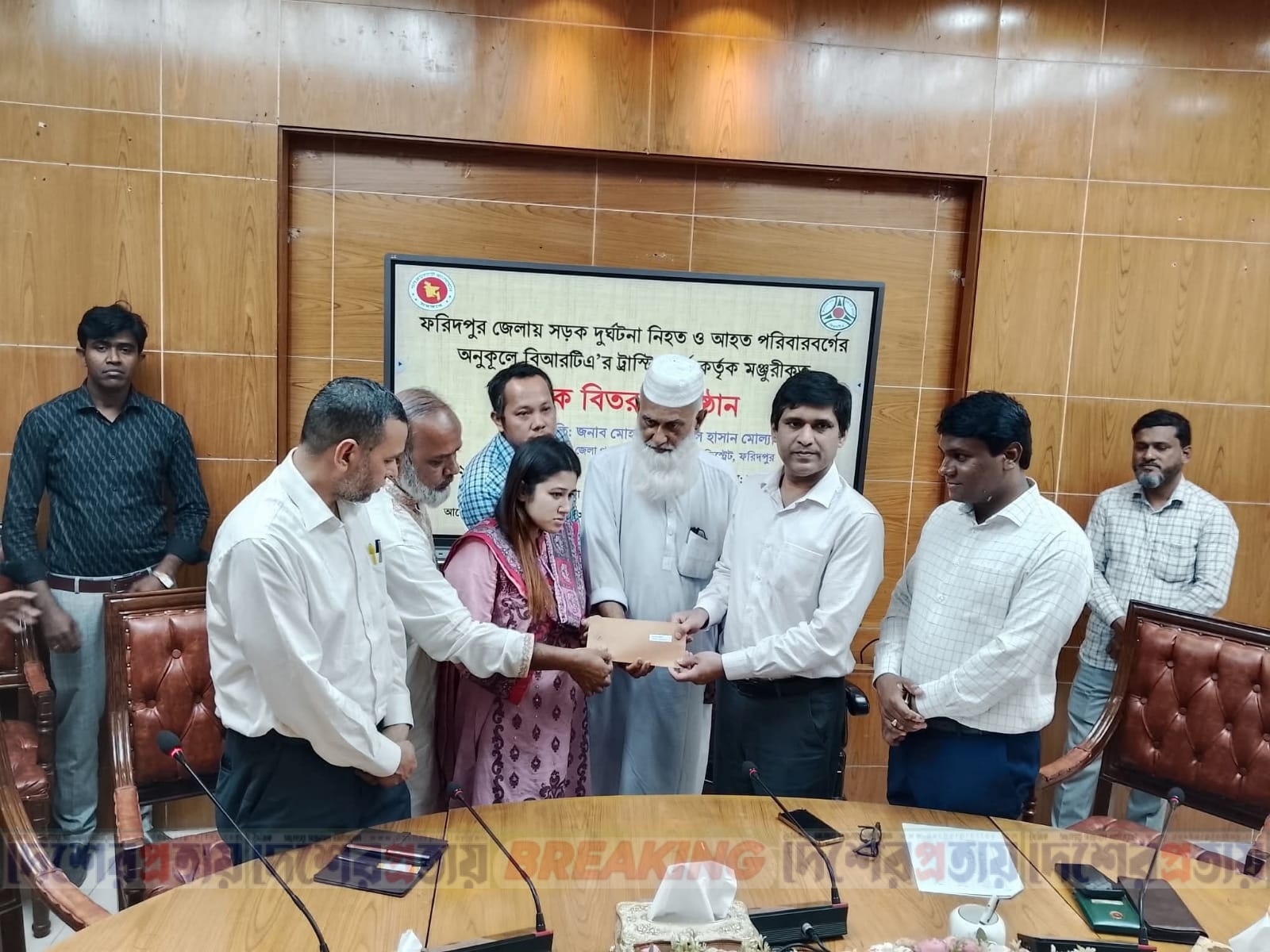 ফরিদপুরে বাংলাদেশ সড়ক পরিবহন কর্তৃপক্ষ (বিআরটিএ) ট্রাস্টি বোর্ডের উদ্যোগে সড়ক দুর্ঘটনায় নিহত ও আহত ব্যক্তিদের পরিবারের মাঝে অনুদানের চেক বিতরণ করা হয়েছে।