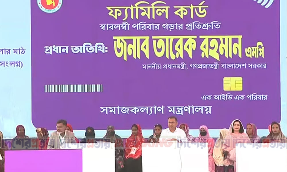 ফ্যামিলি কার্ড কর্মসূচির আনুষ্ঠানিক উদ্বোধনী অনুষ্ঠানে যোগ দিয়েছেন প্রধানমন্ত্রী তারেক রহমান। আজ মঙ্গলবার (১০ মার্চ) সকাল ১০টা ৪০ মিনিটের দিকে রাজধানীর বনানীর কড়াইল বস্তিসংলগ্ন টিঅ্যান্ডটি খেলার মাঠে এই উদ্বোধনী অনুষ্ঠানে প্রধানমন্ত্রী তারেক রহমান যোগ দেন।