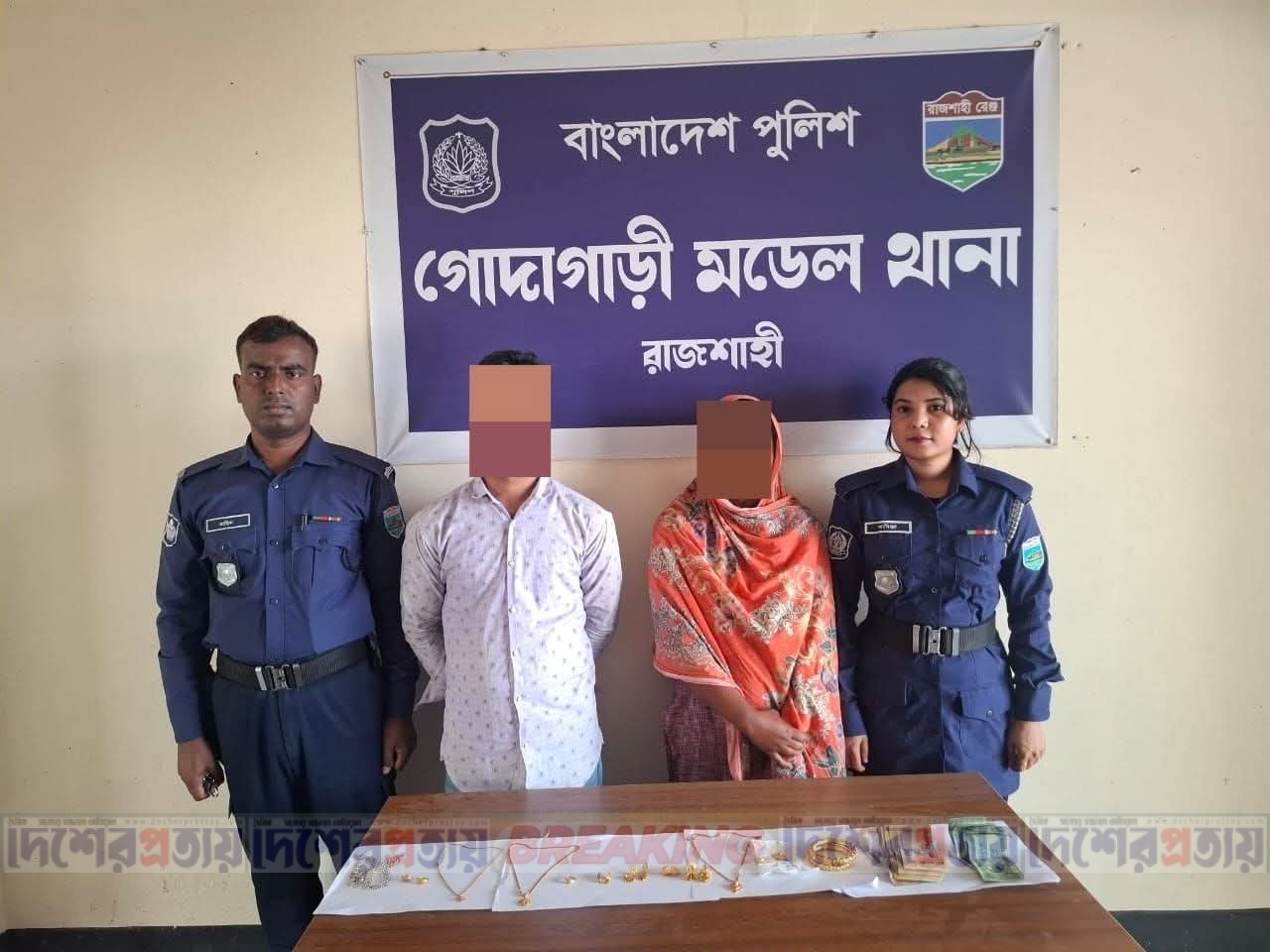 এ ঘটনায় মোঃ আব্দুল মতিন বাদী হয়ে গোদাগাড়ী থানায় মামলা নং-২১, তারিখ-১৫/০৩/২০২৬ খ্রি., ধারা-৪৫৭/৩৮০ পেনাল কোড দায়ের করেন। যার পরিপ্রেক্ষিতে গোদাগাড়ী থানা পুলিশ তথ্য প্রযুক্তির সহায়তায় অভিযান পরিচালনা করে; গোদাগাড়ী থানাধীন কালিয়াঘাটা দাসপাড়া গ্রাম হতে রাত ০১:৪০ ঘটিকায় দুইজন চোরকে চুরিকৃত স্বর্ণালংকার ও ১,৯৪,০০০/-(এক লক্ষ চুরানব্বই হাজার) টাকার মধ্যে অভিযুক্ত মোঃ মুরর্শেদ আলী আকাশের বসত বাড়ির ছাদের স্টোর রুম হতে ০১ জোড়া স্বর্ণের বালা, ০৩ টি স্বর্ণের চেইন, ০৪ জোড়া কানের দুল, ০৫ টি স্বর্ণের আংটি এবং ০১ জোড়া চাদির নুপুর এবং অভিযুক্ত মোসাঃ জয়নব সিফার নিকট হতে ১৪,০০০/-(চৌদ্দ হাজার) টাকা উদ্ধারসহ তাদের গ্রেফতার করে।