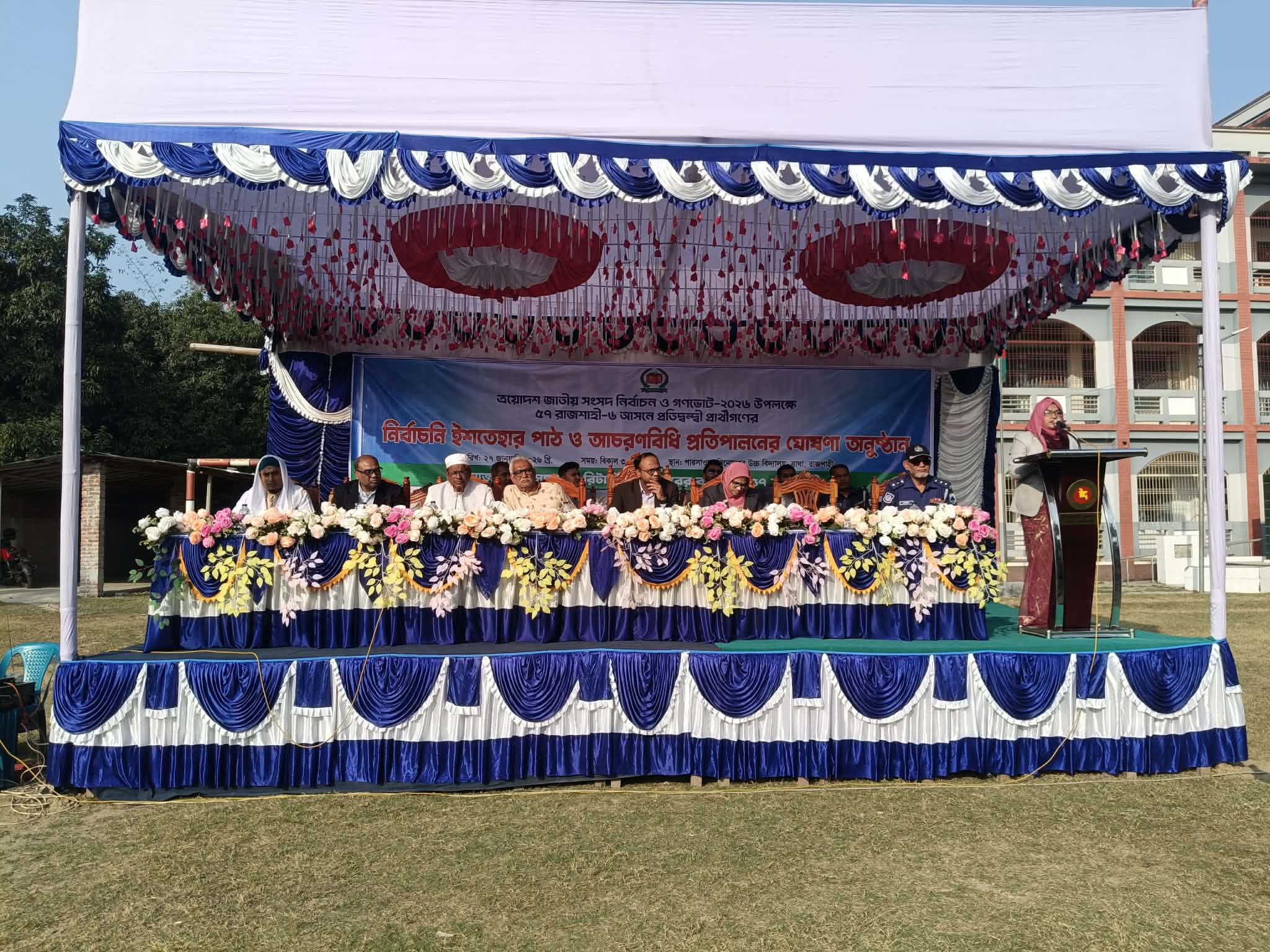 রাজশাহী-৬ (চারঘাট-বাঘা) আসনে ত্রয়োদশ জাতীয় সংসদ নির্বাচন ও গণভোট ২০২৬ উপলক্ষে প্রতিদ্বন্দ্বি প্রার্থীদের নিয়ে নির্বাচনী ইশতেহার পাঠ অনুষ্ঠান অনুষ্ঠিত হয়েছে। মঙ্গলবার (২৭ জানুয়ারী) দুপুরে পারসাওতা বিনোদপুর উচ্চ বিদ্যালয় মাঠে আয়োজিত অনুষ্ঠানে সভাপতিত্ব করেন সহকারী রিটার্নিং কর্মকর্তা ও উপজেলা নির্বাহী কর্মকর্তা শাম্মী আক্তার।