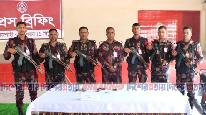 রাজশাহীর সীমান্ত হতে দুইটি বিদেশি পিস্তল, ৪টি ম্যাগজিন, ৮ রাউন্ড গুলি উদ্ধার করেছে বর্ডার গার্ড বাংলাদেশ বিজিবি। শুক্রবার (৬ ফেব্রুয়ারি) ভোর সাড়ে ৫ টার দিকে বাঘা থানাধীন সীমান্তবর্তী এলাকা রাওথা