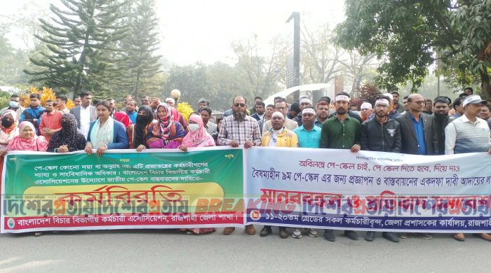 জাতীয় পে-স্কেল বাস্তবায়নের দাবিতে রাজশাহীতে সকল সরকারি, আধা-সরকারি ও স্বায়ত্তশাসিত প্রতিষ্ঠানের কর্মচারীরা প্রতিবাদ সমাবেশ ও মানববন্ধন কর্মসূচি পালন করেছেন। বুধবার সকাল ৯টা ৩০ মিনিট থেকে বিভিন্ন দপ্তরের কর্মচারীরা ব্যানার ও