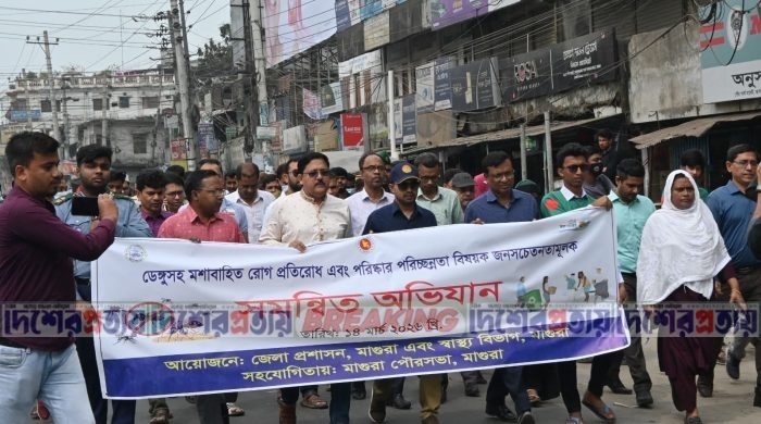 মাগুরায় ডেঙ্গুসহ মশাবাহিত রোগ প্রতিরোধে সমন্বিত অভিযান: জেলা প্রতিনিধি ডেঙ্গুসহ মশাবাহিত রোগ প্রতিরোধ ও পরিষ্কার-পরিচ্ছন্নতা বিষয়ে জনসচেতনতা বৃদ্ধির লক্ষ্যে ১৪ মার্চ ২০২৬ তারিখ সকাল ১০:৩০ টায় জেলা প্রশাসনের উদ্যোগে একটি